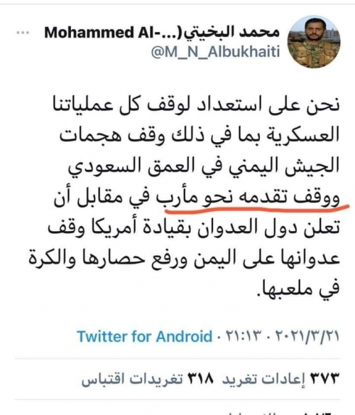 قيادي حوثي يدعو التحالف ايقاف غاراته الجوية في صنعاء دعا القيادي في مليشيات الحوثي محمد البخيتي التحالف العربي إلى ايقاف عملياته العسكرية في مأرب مقابل و...