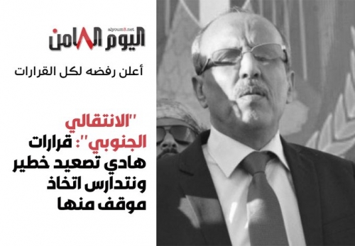 "الانتقالي الجنوبي": قرارات هادي تصعيد خطير ونتدارس اتخاذ موقف أعلن المجلس الانتقالي الجنوبي رفضه لقرارات أصدرها الرئيس اليمني المنتهية ولايته عبدربه منصور هادي، و...