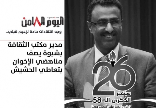 مدير مكتب الثقافة بشبوة يصف مناهضي الإخوان بمتعاطي الحشيش شن مدير مكتب الثقافة في محافظة شبوة الخاضعة لسيطرة تنظيم الإخوان الممول قطريا وتركيا، محمد سالم الأح...