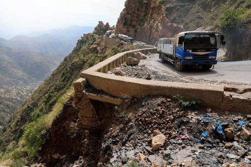 تقرير: انهيار محتمل لطريق "هيجة العبد" يهدد بكارثة إنسانية في تعز تسير شاحنات محملة بمواد مختلفة بحذر وبطء شديدين على طريق عند منحدر جبلي مع منعطفات ض...