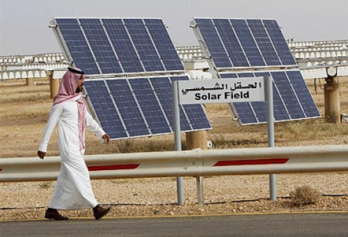المملكة تتطلع لإنتاج 200 جيغاواط من الكهرباء يجري مهندسون سعوديون محاكاة هبوب عاصفة رملية لاختبار متانة ألواح شمسية في مختبر للأبحاث، في مس...