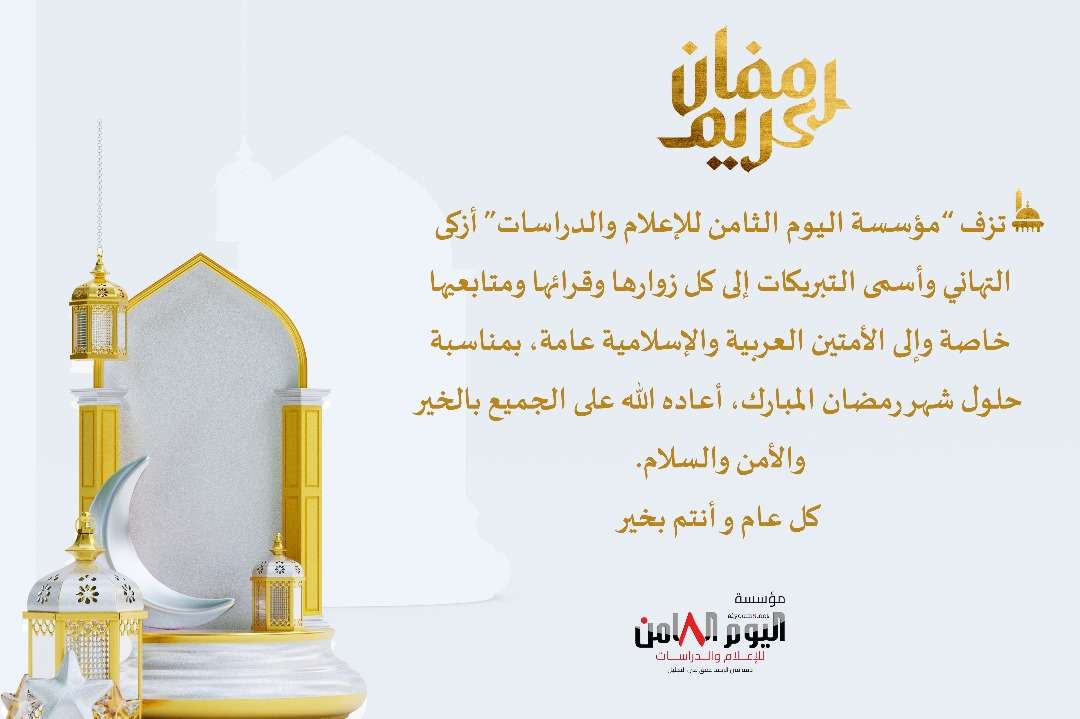 تزف “مؤسسة اليوم الثامن للإعلام والدراسات” أزكى التهاني وأسمى التبريكات إلى كل زوارها وقرائها ومتابعيها خاصة وإلى الأمتين العربية والإسلامية عامة، بمناسبة حلول شهر رمضان المبارك، أعاده الله على الجميع بالخير والأمن والسلام