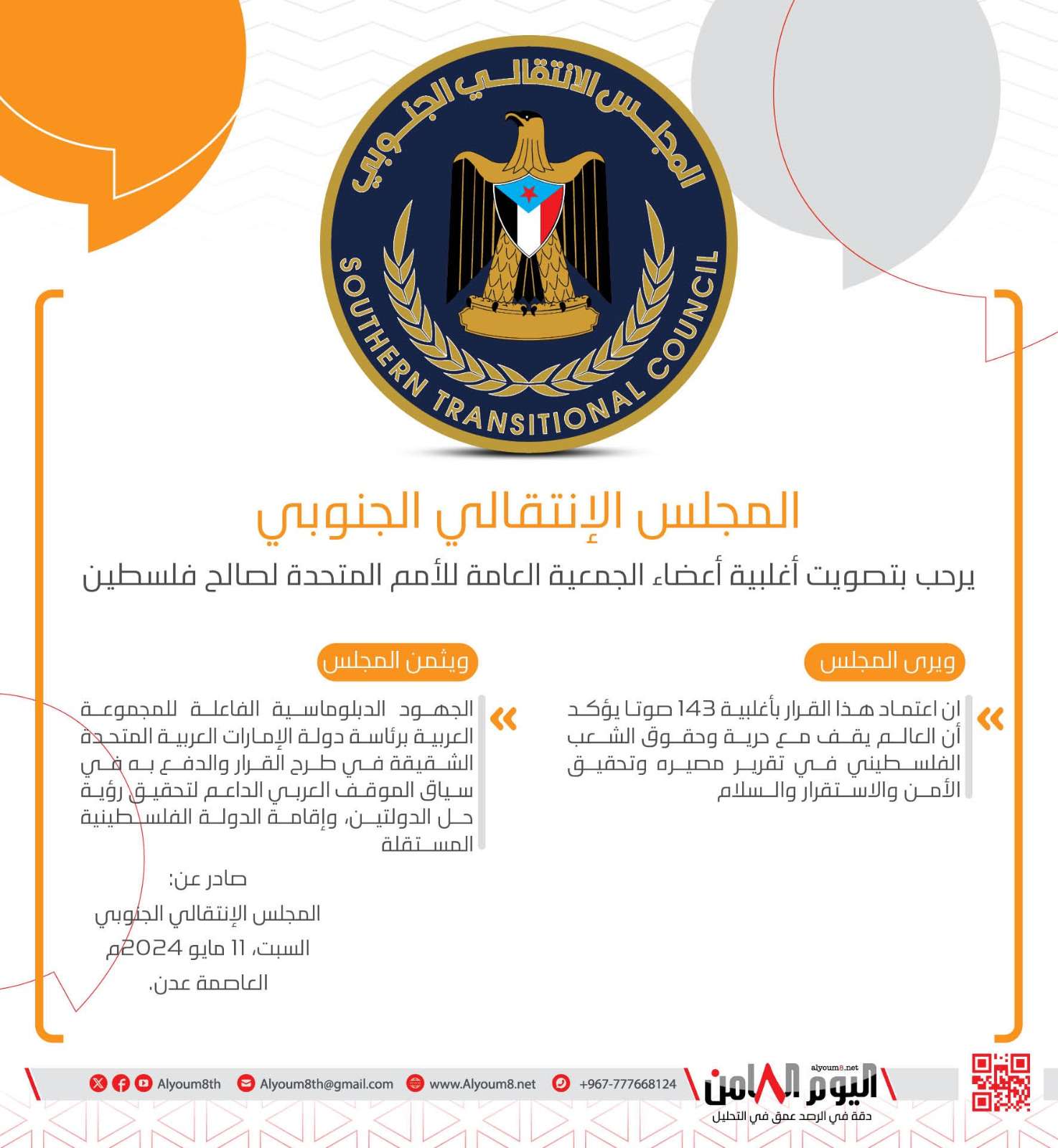 المجلس الانتقالي الجنوبي يُرحب بقرار الأمم المتحدة حول عضوية فلسطين الكاملة