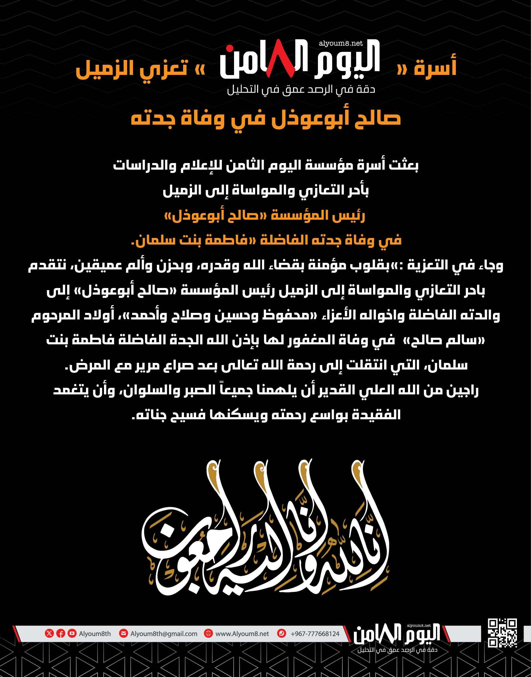 أسرة "مؤسسة اليوم الثامن للإعلام والدراسات" تعزي الزميل صالح أبوعوذل في وفاة جدته