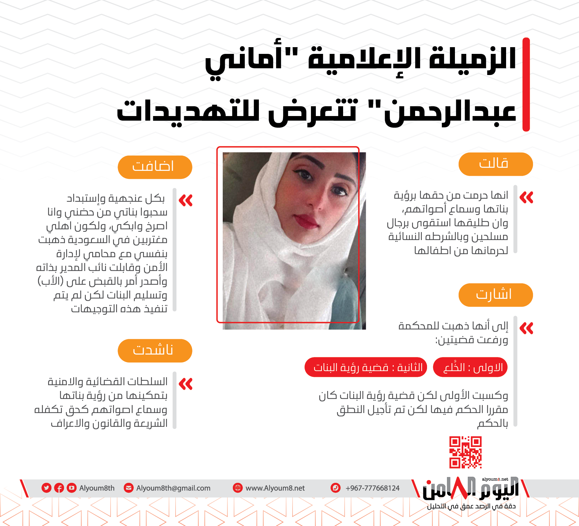 انفوجرافيك | ناشطة وإعلامية تشكو تعرضها للتهديدات وحرمانها من رؤية بناتها