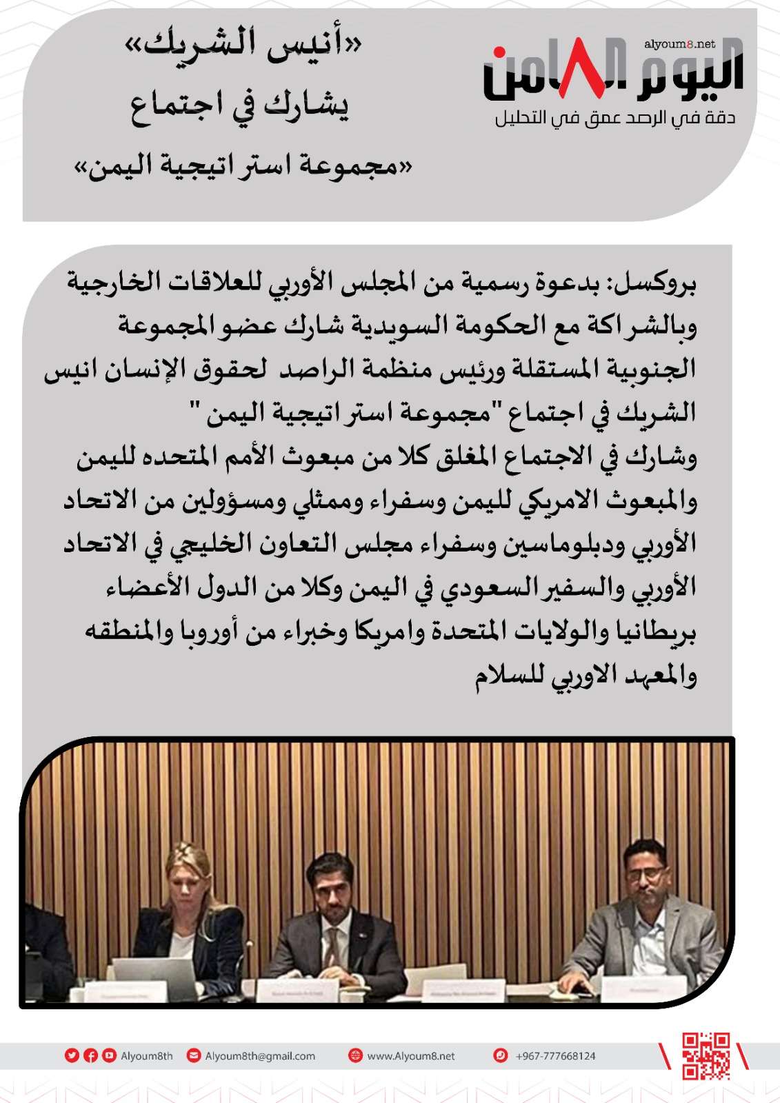 بروكسل بدعوة رسمية من المجلس الأوربي للعلاقات الخارجية وبالشراكة مع الحكومة السويدية شارك عضو المجموعة الجنوبية المستقلة ورئيس منظمة الراصد لحقوق الإنسان انيس الشريك باجتماع مجموعة استراتيجية اليمن