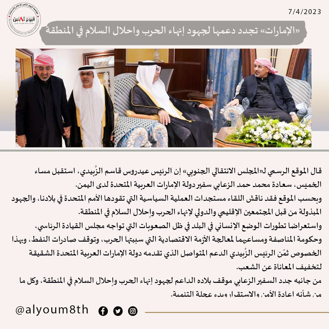 «الإمارات» تجدد دعمها لجهود إنهاء الحرب واحلال السلام في المنطقة