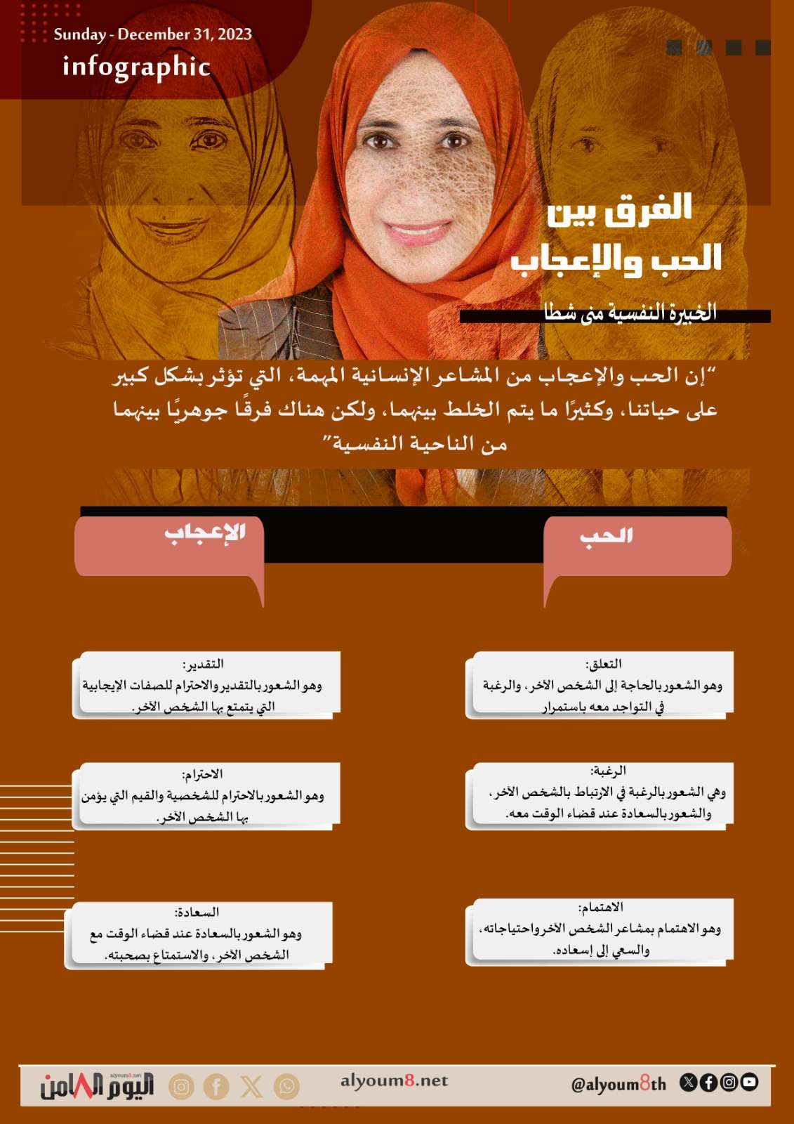 الاخصائية النفسية منى شطا، تقول إن الحب والإعجاب من المشاعر الإنسانية المهمة، التي تؤثر بشكل كبير على حياتنا، وكثيرًا ما يتم الخلط بينهما، ولكن هناك فرقًا جوهريًا بينهما من الناحية النفسية