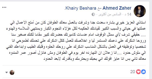 وأضاف أحمد زاهر ، قائلاً: "أشكرك على دعمك المستمر ليا و إخلاصك للعمل ككل، أشكرك على تحملك لطموحى أنا شخصيا وتوظيفه فى العمل بالشكل المناسب، أشكرك على روحك الحلوة وقلبك الطيب، و أبداعك الفنى اللى ملوش حدود، أنا زعلان إن النهاردة آخر يوم فى الطوفان ومش هانزل أصور عمر المندوه معاك تانى، بس أنا عايز اقولك أنى بحبك و بحترمك وبأقدرك لأبعد الحدود".