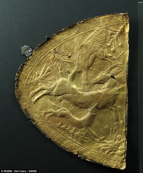 وتحمل بعض القطع الذهبية صورا لحيوانات تتقاتل، وهى صور غريبة على الفن المصرى ما يؤكد ورودها من بلاد أخرى هى سوريا.