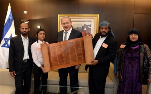 رئيس الوزراء الإسرائيلي نتنياهو خلال استقابله الهود اليمنيين ومعهم المخطوطة التاريخية في مارس 2015م