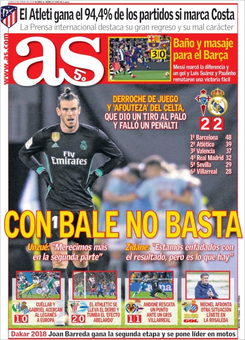 فى حين نشرت صحيفة "آس" المدريدية عنواناً يقول "مع بيل لا يكفى"، فى إشارة للويلزى جاريث بيل صاحب الثنائية.