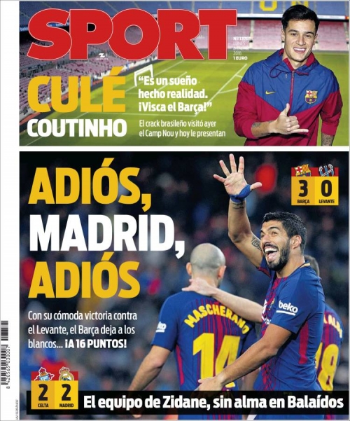 ونشرت صحيفة "سبورت" على غلافها صورة للأوروجويانى لويس سواريز صاحب الهدف الثانى للفريق، وهو يلوح بيده وكتبت "وداعاً مدريد، وداعاً".