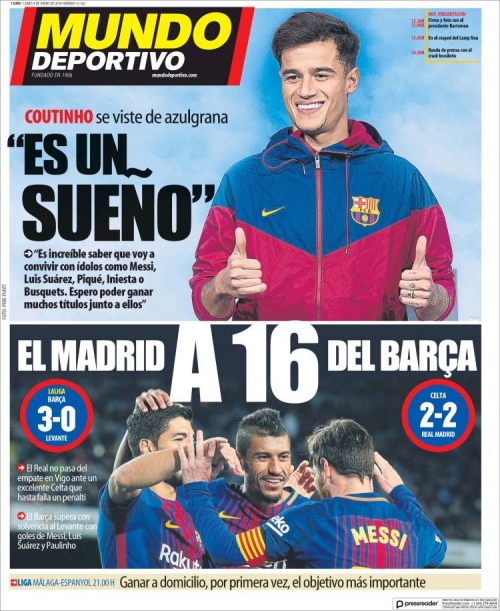 واهتمت أيضاً كلتا الصحيفتين بنبأ إتمام صفقة صانع الألعاب البرازيلى فيليب كوتينيو، وانتقاله للبلوجرانا قادماً من ليفربول الإنجليزى مقابل 160 مليون يورو.