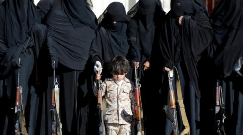 طفل إلى جانب نساء حوثيات في تجمع مسلح بصنعاء