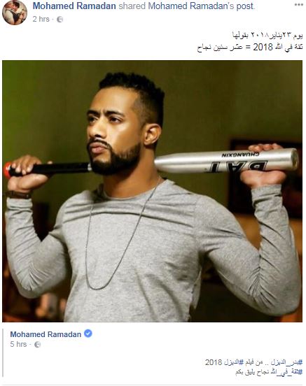 نشر الفنان محمد رمضان صورة له من فيلم "الديزل"، الذى يقوم بتصويره حاليا، وعلق عليها قائلا: "يوم ٢٣ يناير ٢٠١٨ بقولها ثقة فى الله 2018 = عشر سنين نجاح".