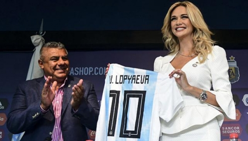لوبيرفا تحمل قميص التانجو مع تابيا رئيس الاتحاد الأرجنتينى على الأيسر