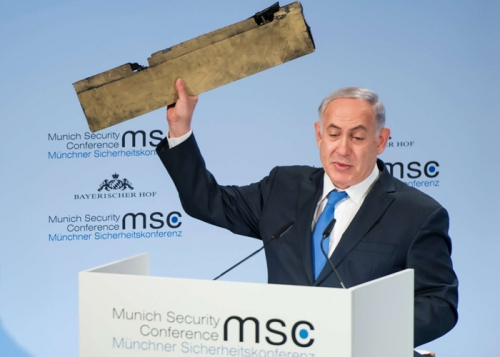 وقال نتنياهو في كلمة أمام مؤتمر ميونيخ للأمن، بينما كان يمسك بقطعة مما يقول إنها الطائرة الإيرانية بدون طيار التي أسقطت بعد دخولها المجال الجوي الإسرائيلي هذا الشهر “إسرائيل لن تسمح للنظام بلف حبل الإرهاب حول عنقنا”.