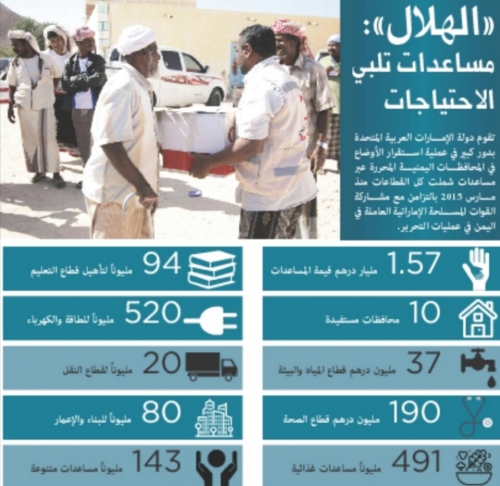 يذكر أن قيمة المساعدات الإنسانية والعمليات الإغاثية والمشاريع التنموية التي نفذتها هيئة الهلال الأحمر الإماراتي للأشقاء في اليمن في الفترة من مارس 2015 وحتى الآن بلغت ملياراً و574 مليوناً و907 آلاف درهم استفادت منها 10 محافظات يمنية.