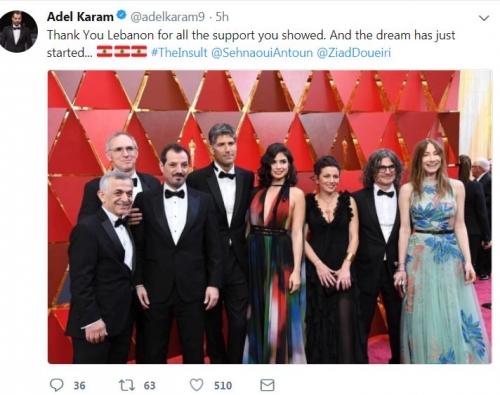 ونشر كرم صورة لفريق الفيلم، عبر حسابه بموقع التدوينات القصيرة "تويتر"، مصحوبة بتعليق :" شكرا لبنان على كل هذا الدعم والحلم قد بدأ للتو"، وذلك فى إشارة لبداية مشوار العالمية بالترشيح فى الأوسكار.