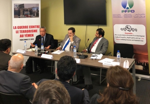 أكد دبلوماسيون وحقوقيون شاركوا في ندوة «الحرب ضد الإرهاب في اليمن» التي نظمها «منتدى باريس للسلام والتنمية» أمس أن الحرب على الإرهاب غير مرتبطة بنطاق جغرافي بل هي مسألة تعني كامل المجتمع الدولي، محذرين من محاولة التنظيمات الإرهابية إعادة تجمعها في مناطق أخرى من العالم العربي وعلى وجه الخصوص اليمن في ظل الانقلاب الحوثي الإرهابي.