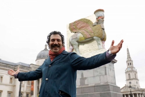 عرض الفنان الأميركي المتحدر من أصول عراقية مايكل راكويتز، الأربعاء، نسخة مقلدة من تمثال الثور المجنح الآشوري، الذي دمره مقاتلو تنظيم داعش في العراق عام 2015، في ميدان الطرف الأغر في قلب العاصمة البريطانية لندن.
