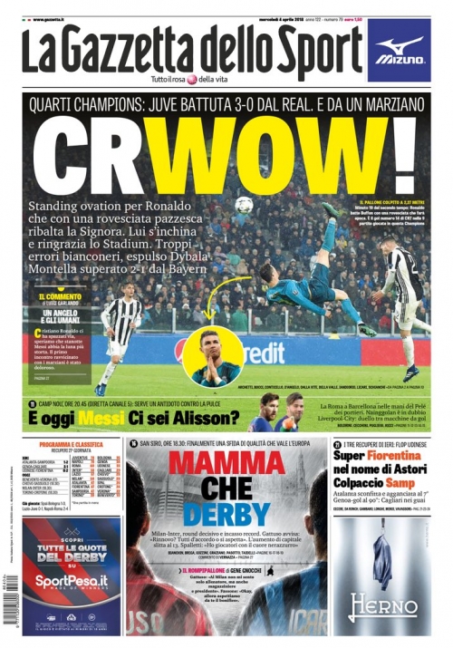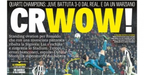 فى حين كتبت صحيفة "توتو سبورت" الإيطالية، "من كوكب آخر"، وتصدر غلاف الصحيفة مقصية كريستيانو رونالدو التى أذهلت العالم فى شباك بوفون حارس يوفنتوس".