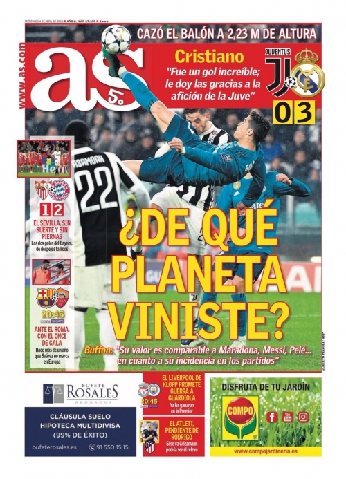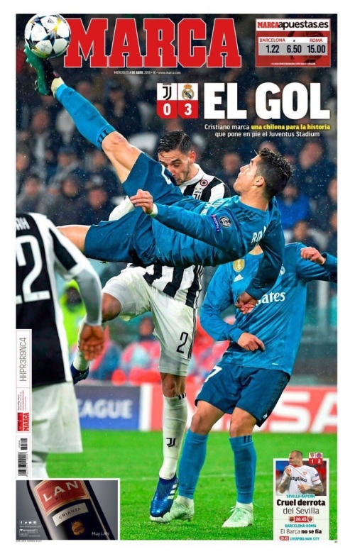وإلى الصحافة الإسبانية، حيث عنونت صحيفة "آس"، "من أى كوكب آتيت.. ريال مدريد 3 – 0 يوفنتوس"، بينما كتبت صحيفة "ماركا"، "الهدف.. كريستيانو رونالدو يسجل عودة تاريخية وجماهير يوفنتوس تصفق له"، فيما عنونت صحيفة "Sphera Sports " التى تصدر من مدينة "برشلونة"، "تحفة فنية"، فى إشارة إلى هدف كريستيانو رونالدو المذهل فى شباك يوفنتوس.