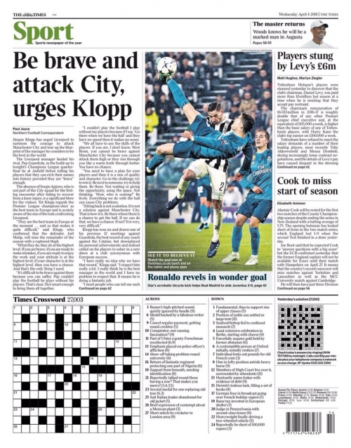 فى حين عنونت صحيفة "التايمز"، "كريستيانو رونالدو يزيح الستار عن الهدف الأعجوبة"، جدير بالذكر أن مباراة الإياب ستقام الأربعاء المقبل بملعب "سانتياجو برنابيو" معقل ريال مدريد.