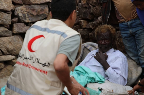 مندوب من هيئة الهلال الأحمر الإماراتي يستمع إلى مطالب احد النازحين في الضالع