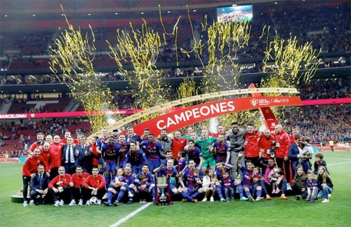 وسجل لويس سواريز هدفين في الشوط الأول ليتوج برشلونة باللقب للمرة الـ30، وهو رقم قياسي، لكن إنيستا وميسي لعبا دور البطولة ليتلقى فريق المدرب فينشنزو مونتيلا هزيمة ثقيلة. وصنع فيليب كوتينيو الهدف الأول لسواريز في الدقيقة 14 وسيطر برشلونة على باقي المباراة.