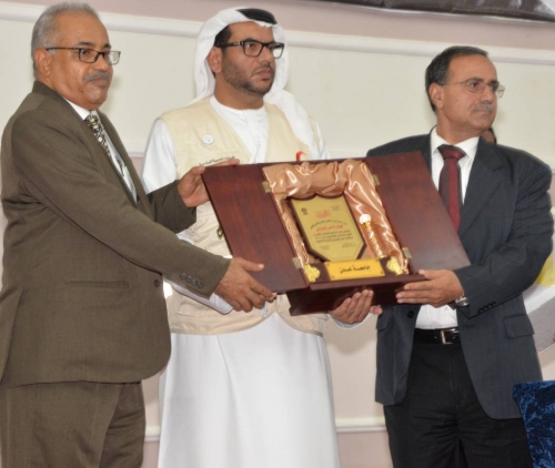 وتسلم نائب مدير الهلال الأحمر الاماراتي طيب الشامسي من رئيس جامعة عدن الدكتور الخضر ناصر لصور ، والدكتور محمد العطاس نائب رئيس الجامعة لشؤون الطلاب "درع الوفاء" تقديرا وعرفانا بدعمهم السخي للأنشطة الطلابية في جامعة عدن ، وسط تحايا حاره وتفاعل كبير من كافة الحضور في قاعة ابن خلدون بكلية الآداب .