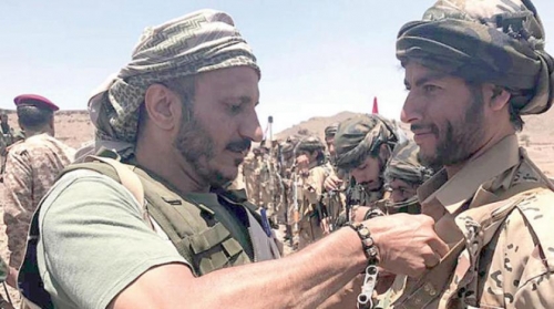 طارق صالح مع أحد أفراد القوات التي يقودها غرب اليمن