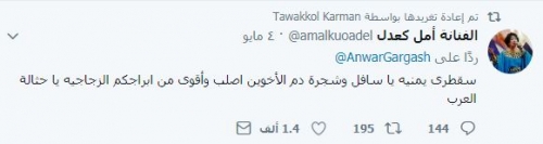 واعادت القيادية الإخوانية والحائزة على الجنسية القطرية توكل كرمان تغريد رد باسم الحساب المنتحل على وزير الدولة الإماراتي الدكتور أنور قرقاش، قبل ان يهب ناشطون إلى نفي تهمة ان يكون الحساب حقيقي لأمل كعدل التي تعاني من ظروف صحية صعبة.