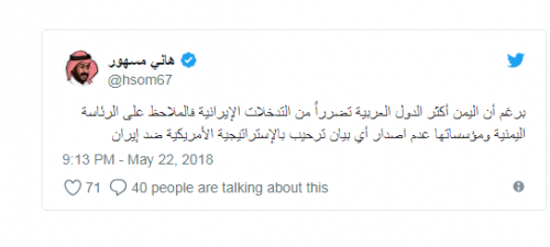 وقال الكاتب والصحفي اليمني هاني مسهور في تغريدة له بصفحتة الرسمية بموقع التواصل الاجتماعي "تويتر" :برغم أن اليمن أكثر الدول العربية تضرراً من التدخلات الإيرانية فالملاحظ على الرئاسة اليمنية ومؤسساتها عدم اصدار أي بيان ترحيب بالإستراتيجية الأمريكية ضد إيران.