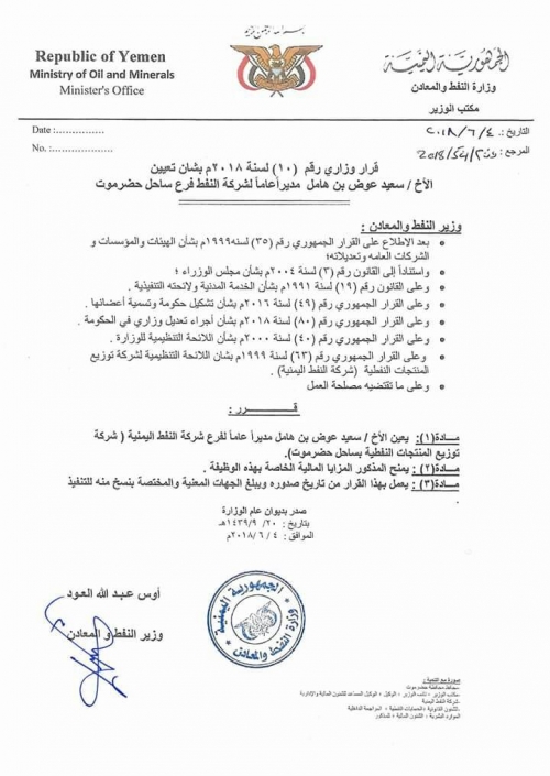 حيث قضت المادة الأولى بتعيين "الاستاذ سعيد بن هامل" مديرًا عامًا لفرع شركة النفط والمعادن في ساحل حضرموت