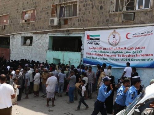 توزيع سلل غذائية في عدن من الهلال الأحمر الإماراتي