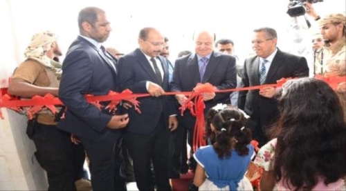 الرئيس هادي مع رئيس الحكومة بن دغر اثناء افتتاح شركة الاتصالات الجديدة "عدن نت"