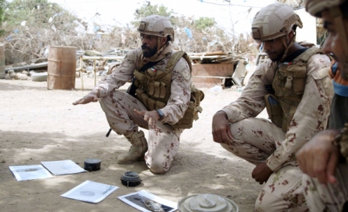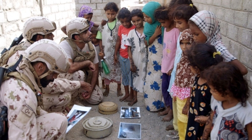 أعضاء فريق من الهندسة الميدانية التابعة للقوات المسلحة الإماراتية العاملة ضمن التحالف العربي يشرحون لمجموعة من أطفال محافظة الحديدة مخاطر الألغام، وذلك ضمن حملة توعية لأهالي مناطق وقرى الساحل الغربي المحرّرة بمخاطر الألغام والعبوات الناسفة التي زرعها الحوثيون بشكل عشوائي وكثيف، وإرشادهم إلى طرق تفاديها والتوقي منها، خصوصا وأن تلك الأجسام مزروعة داخل مناطق سكنية ومموهة بطرق “مبتكرة” على شكل أدوات منزلية وعبوات مشروبات وأحجار.