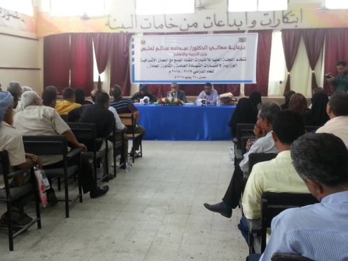 نظمت اليوم اللجنة العليا للاختبارات، في مبنى الكنترول بالعاصمة عدن، لقاءً موسعا مع اللجان الإشرافية الوزارية لاختبارات الثانوية العامة، للعام الدراسي الحالي 2017-2018، برعاية وحضور وزير التربية والتعليم الدكتور عبدالله سالم لملس، وكذا حضور وكيل وزارة الداخلية المساعد لقطاع الأمن والشرطة، اللواء أحمد علي مسعود، ومدير عام الاختبارات، الأستاذ عوض عبدالله عبده، ووكلاء وزارة التربية وعدد من مدراء العموم ورؤساء اللجان الفرعية لاختبارات الثانوية العامة للعام الحالي في المحافظات المحررة.
