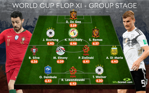 وذكرت صحيفة "الجارديان" البريطانية أن التشكيلة الأسوأ لدور المجموعات فى بطولة كأس العالم، ضمت كلاً من، دافيد دى خيا حارس إسبانيا، والإسبانى سيرجيو راموس، والسنغالى خاليدو كويبالى، والألمانى جيروم بواتينج، والأرجنتينى آنخيل دى ماريا، والمصرى محمد الننى، والبولندى بيوتر زيلينسكى، والبرتغالى برناردو سيلفا، والألمانى تيمو فيرنير، والبولندى روبرت ليفاندوفسكى، والفرنسى عثمان ديمبلى.