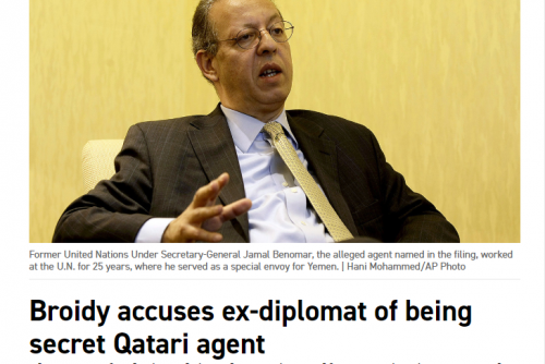 قالت صحيفة "بوليتيكو" الأمريكية إن رجل الأعمال الأمريكي، إليوت برويدي، أقام دعوى قضائية أمام محكمة في ولاية كاليفورنيا، اتهم فيها المبعوث الخاص السابق للأمم المتحدة إلى اليمن جمال بن عمر، بأنه عميل سري يعمل لصالح قطر.