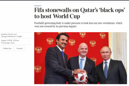 قالت صحيفة "صنداي تايمز"، الأحد، إن الاتحاد الدولي لكرة القدم (الفيفا) يتعرض لضغوط قوية لفتح تحقيق فيما يتعلق بكيفية حصول قطر على حق تنظيم كأس العالم 2022، بعد اكتشاف أن مسؤولي الاتحاد القطري الذين تم تكليفهم بإدارة ملف تنظيم البطولة أداروا حملة "عمليات سوداء" ضد ملفات الدول المتنافسة، لمنح تنظيم البطولة لقطر.