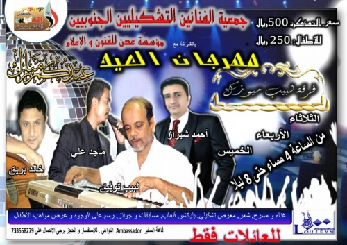 تنظم جمعية الفنانين التشكليين بالتعاون مع مؤسسة عدن للفنون والاعلام مهرجان ترفيهي بمناسبة عيد الاضحى المبارك.