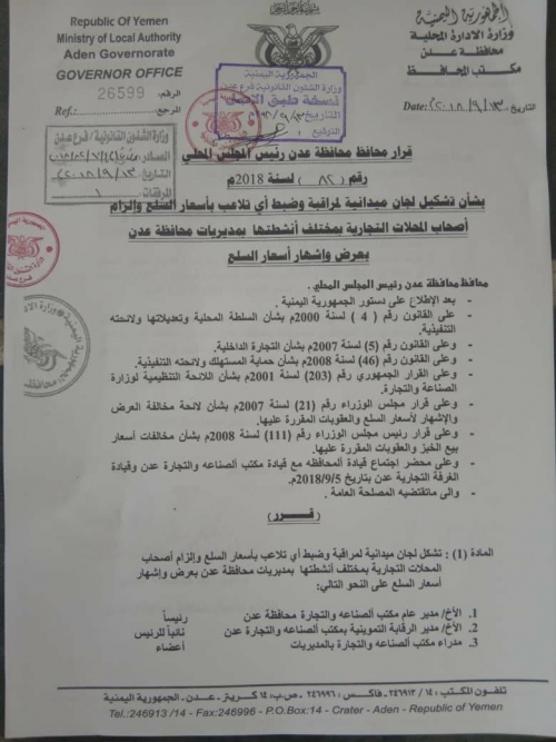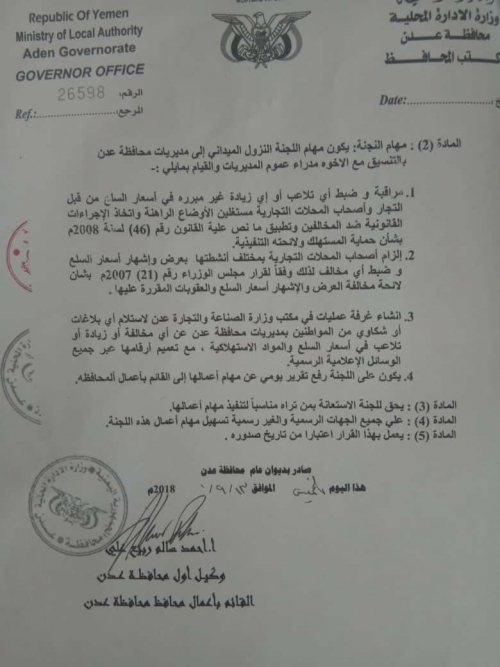 أصدر القائم بأعمال محافظ عدن احمد سالمين قرارا محليا قضى بتشكيل لجنة ميدانية لمراقبة أسعار بيع السلع الغذائية في العاصمة في أول اجراء لمواجهة انهيار العملة وغلاء المعيشة.