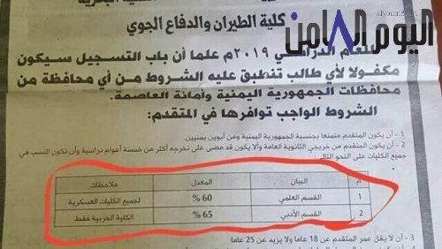 وقال مصدر يمني لـ(اليوم الثامن) "إن مليشيات الحوثي الإرهابية دعت شباب اليمن من خريجي الثانوية العامة الى التسجيل في كلية الطيران، في محاولة لتجنيدهم والزج بهم في جبهة الحديدة، عقب خسارة الكثير من مقاتليهم هناك".