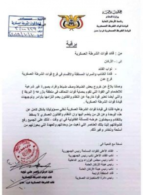 وتداولت وسائل إعلامية وثيقة موقعة من قائد الشرطة العسكرية اللواء ناصر النوبه،ـ لم يتسن لنا التأكد من صحتهاـ اعتبار تلك القوات المنشقة،خارجة عن النظام والقانون بعدم التزامها بأوامر قيادة الشرطة العسكرية وخروجهم بجميع العهد التي بحوزتهم من أسلحة وذخائر وأشياء أخرى .