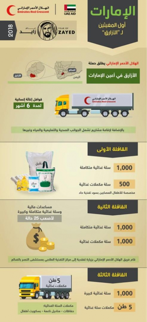 أعلن الهلال الأحمر الإماراتي عن استمرار تسييره لقوافل المساعدات الإنسانية ولفترة ستة أشهر متتالية وبشكل أسبوعي ضمن تدخلاته العاجلة لإغاثة أهالي مديرية الأزارق، جراء كارثة المجاعة التي تفتك بسكان المديرية بضراوة في محافظة الضالع.