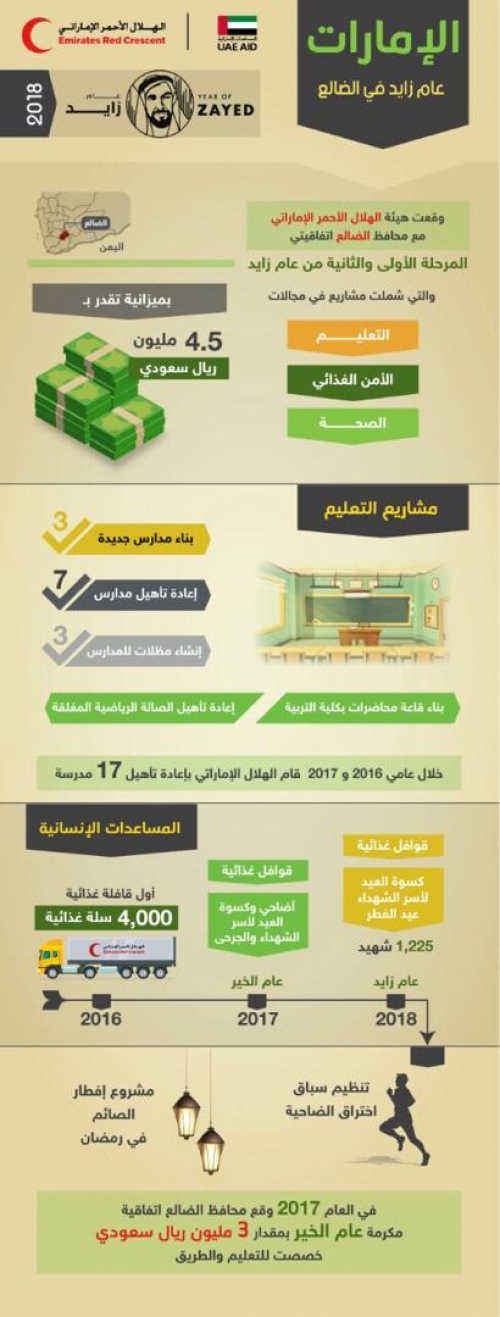 وقعت “هيئة الهلال الأحمر الإماراتي” مع محافظ الضالع اللواء علي مقبل في إطار عام زايد 2018 اتفاقيتي المرحلة الأولى والثانية من عام زايد، والتي شملت عددا من المشاريع في مجالات التعليم والأمن الغذائي والصحة وتقدر بـ 4 ملايين ونصف مليون ريال سعودي.
