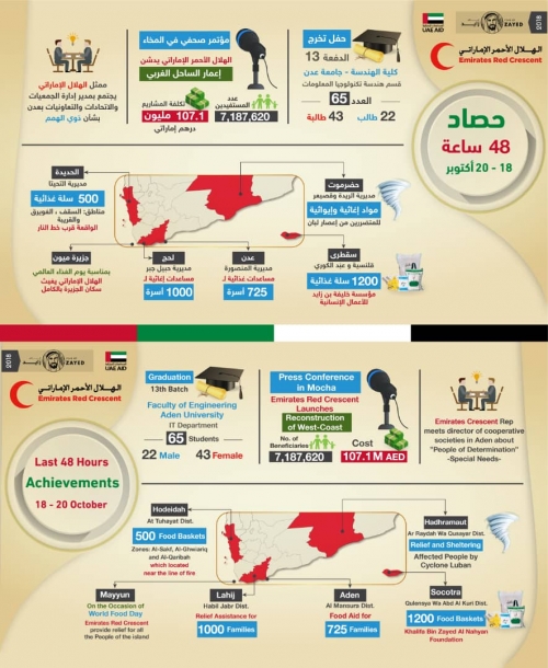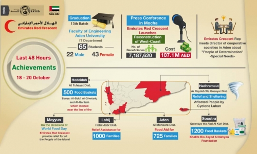 جملة من المشاريع والأنشطة واللقاءات المستمرة والمتواصلة من قبل الهلال الاماراتي في المحافظات المحررة حيث دشن مرحلة اعمار الساحل الغربي ورعى حفل تخرج دفعة من طلاب كلية الهندسة بجامعة عدن وعقد لقاء لبحث متطلبات ذوي الاحتياجات الخاصة مع مكتب الشؤون الاجتماعية بعدن وسير قوافل اغاثية الى لحج وسقطرى وميون وحضرموت والحديدة وغيرها ، تلك هي ابرز انشطة وفعاليات الهلال الأحمر الاماراتي خلال 48 الماضية باليمن.